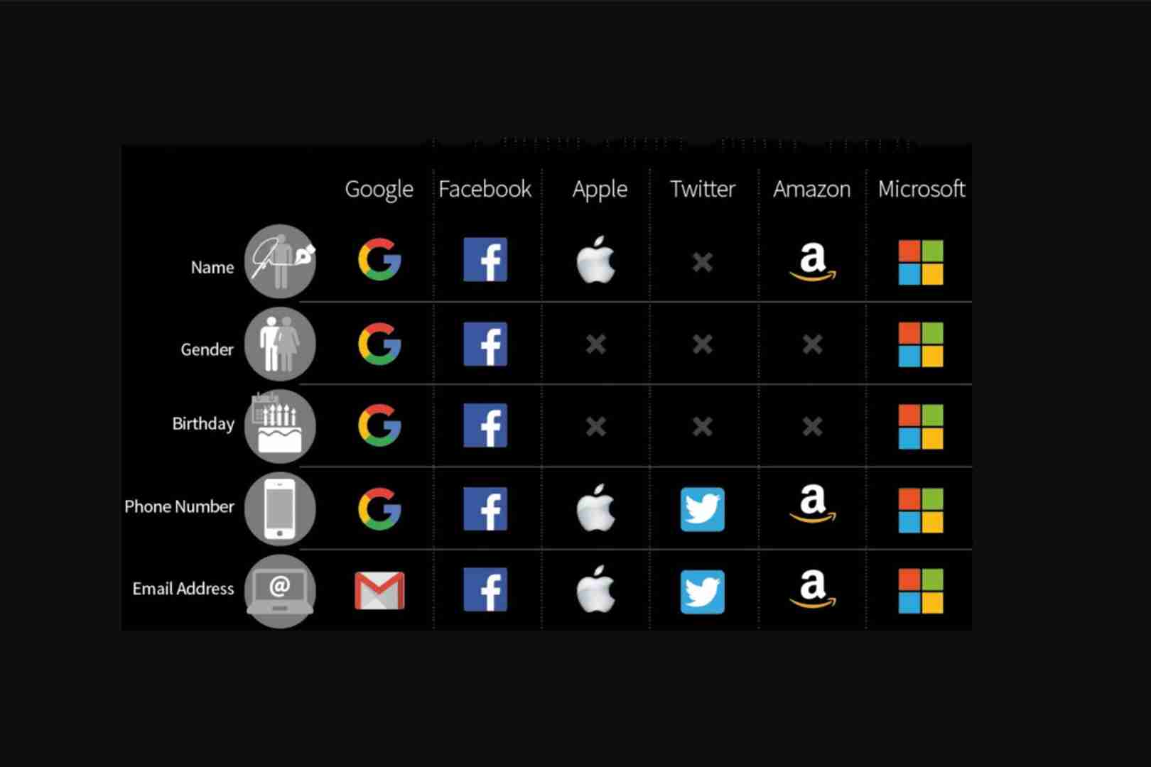 Security Baron的员工检查了Facebook,Google,Apple,Twitter,Amazon和Microsoft的隐私政策,并整理了一张方便的信息图,显示了每家公司都承认收集的数据类型。对于Facebook和其他人来说,数据就是金钱。但是,这些科技巨头实际上对您了解多少可能令人惊讶。